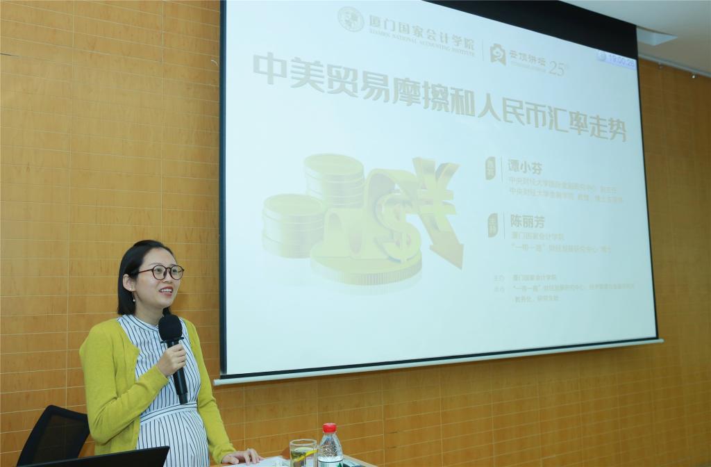 9月21日,中央财经大学国际金融研究中心副主任谭小芬教授应邀做客“一带一路”财经发展研究中心、经济管理与金融研究所共同举办的第二十五期“云顶讲坛”,为现场观众带来题为《中美贸易摩擦和人民币汇率走势》的精彩讲座。本期讲坛由 “一带一路”财经发展研究中心陈丽芳博士主持。