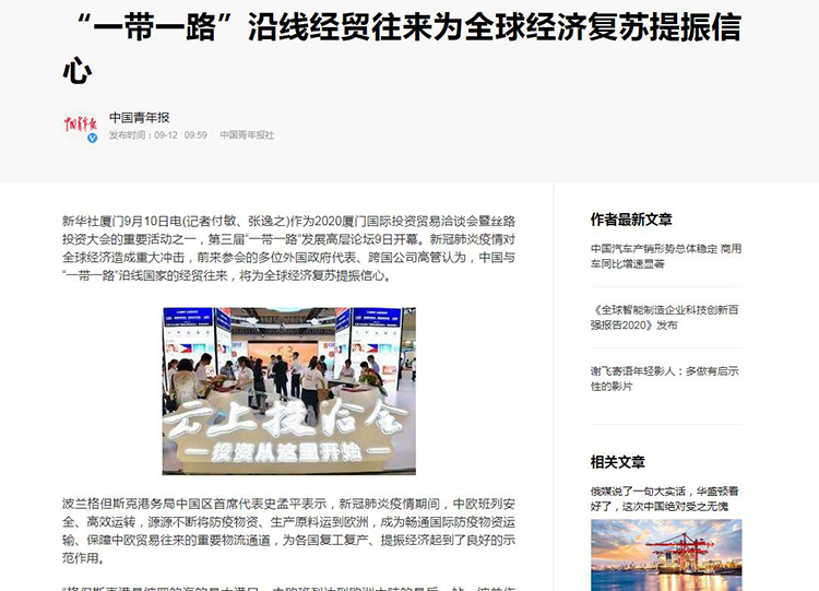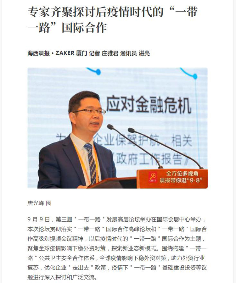 9月9日,我院携手厦门国际投资贸易洽谈会组委会、中国国际经济合作学会联合主办的“一带一路”发展高层论坛在厦成功举办。省内外多家媒体对本次论坛高度关注,中新网、中国青年报、香港经济导报、中国会计报、《财务与会计》杂志、潇湘晨报、东南卫视、厦门卫视、厦门日报、海西晨报等多家主流媒体纷纷报道和转载了这一盛况,进一步扩大了本次论坛的影响力。