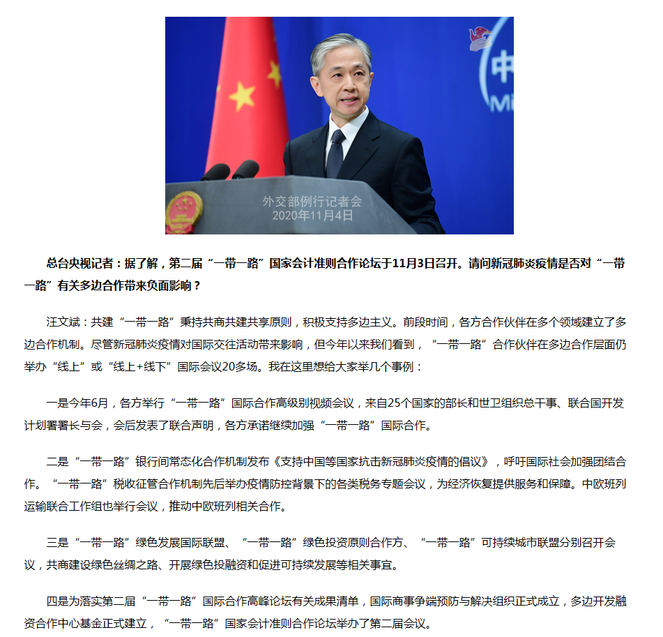 11月4日,外交部发言人汪文斌就此答记者问,肯定了疫情期间包括“一带一路”国家会计准则合作论坛在内的各项多边合作取得积极进展,将继续为高质量共建“一带一路”、助力各方抗击疫情、促进经济社会恢复、落实联合国2030年可持续发展议程做出贡献。央视网新闻、《中国财经报》《中国会计报》《厦门日报》《潇湘晨报》等多家媒体也围绕论坛进行转载报道。
