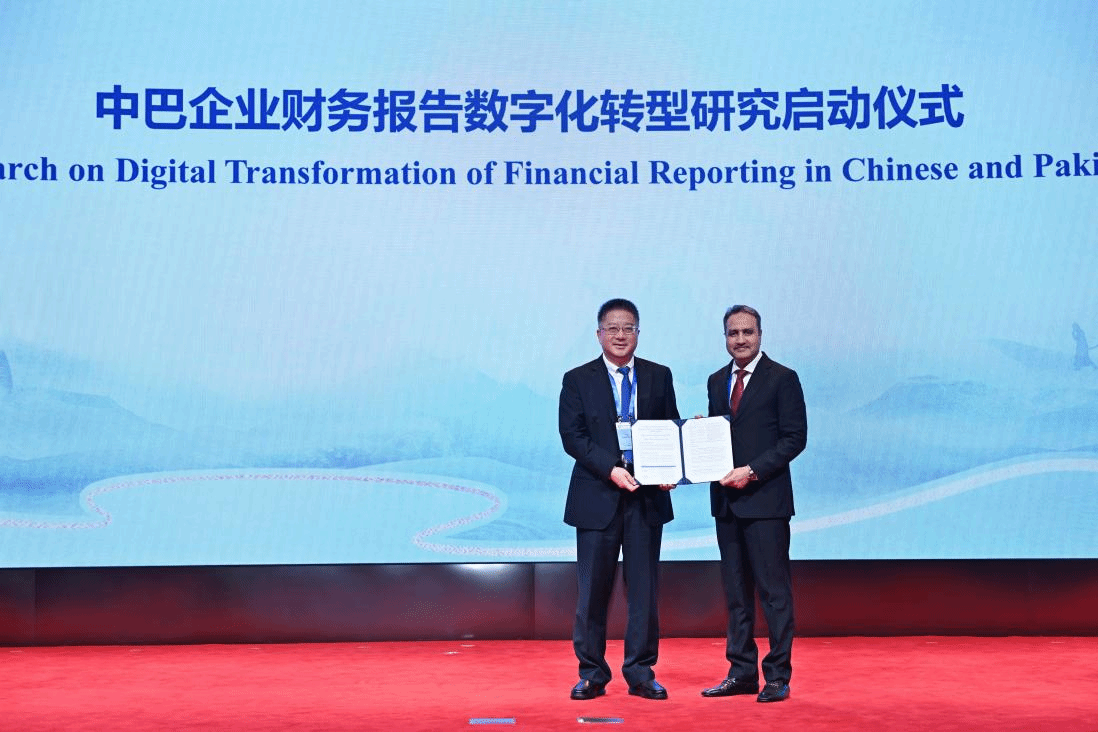 丁友刚与巴基斯坦特许会计师公会主席塞夫·乌拉代表双方机构共同启动合作论坛的首个合作研究项目——“中巴企业财务报告数字化转型研究”,并在论坛闭幕式上致辞。