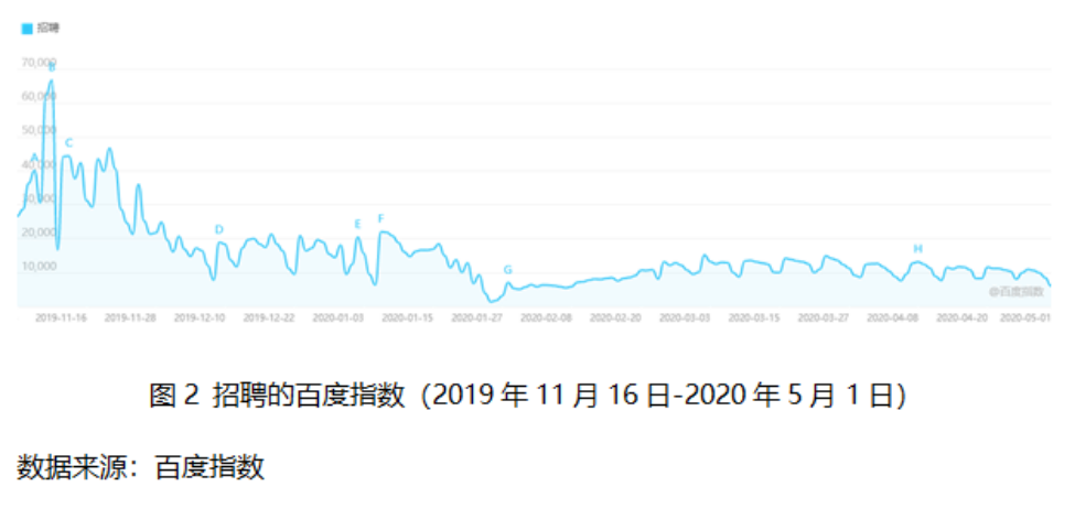 2020年全国高校毕业生达870万人,考研报名人数达340万人。4月22日,中国人民大学中国就业研究所和智联招聘共同发布了《2020年大学生就业力报告》,1 月份大学生招聘需求人数同比增加了1.83%,而2月和3月招聘需求人数同比分别下降了21.67%和26.69%;在供给方面,1月和2月同比增幅较小,分别为5.85%和 12.30%,但3月份毕业生开始进入春季招聘市场,求职申请人数同比增幅高达 143.25%。与去年同期相比,今年一季度大学生招聘需求人数减少了 16.77%, 但求职申请人数增加 69.82%。根据“招聘”的百度指数(如图2所示),自去年11月中旬达到阶段性高点以后便下跌企稳,连往年的春招旺季该指数都没有任何起色,显示疫情下用人单位对于新员工的需求下降。