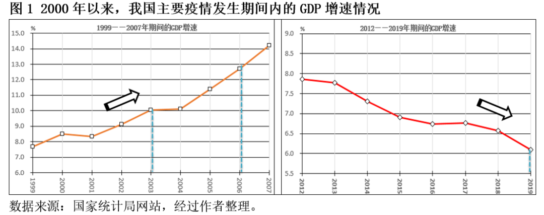 近30年来,全球爆发的重大突发疫情事件,不但威胁了人们的生命健康,还给疫情地区的经济造成了不同程度损失。从财税政策的抗疫经验看,无论是疫情爆发初期、中期还是后期,及时、有效和精准的应急财税政策将非常有助于遏制疫情发展和经济恢复。但是,由于疫情对经济的影响有可能处于不同的经济调整期,其财税政策的应对措施也应是有所不同的。如下图1所示,在2003年非典型肺炎(“非典”)时期,我国经济正处于快速高增长时期,因此在应对疫情的财税政策上,政策发力点主要集中在疫情初期和中期的疫情应对上。同样,2005-2006年爆发的高致病性禽流感恰好也是正处于经济高速增长期间内,其应急财税政策亦是集中在初期和中期的疫情应对上面。