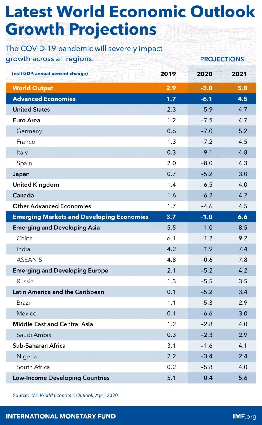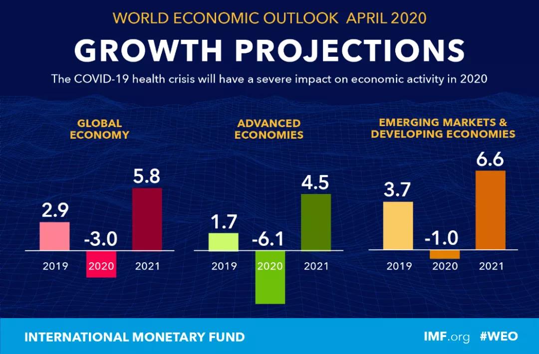 4月14日,在美国首都华盛顿,国际货币基金组织(IMF)首席经济学家吉塔·戈皮纳特出席视频新闻发布会发布最新一期《世界经济展望报告》,对全球今明两年的经济发展做了悲观预测。他预计2020年世界GDP将下降3%,是上世纪30年代大萧条以来最大幅度的年度下降,也是全球首次出现发达经济体和新兴经济体同时进入衰退的情况。其中,美国和欧元区将分别下降5.9%和7.5%,发达经济体整体下降6.1%。