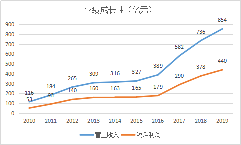 当然,茅台是奢侈品,所以定价与成本弱相关,而与品牌强相关。譬如,2019年茅台的营业收入比2018年增长了117.91亿元,但营业成本仅仅比2018年增长8.8亿元。可见,茅台的定价是供求驱动型的,而不是成本驱动型的。