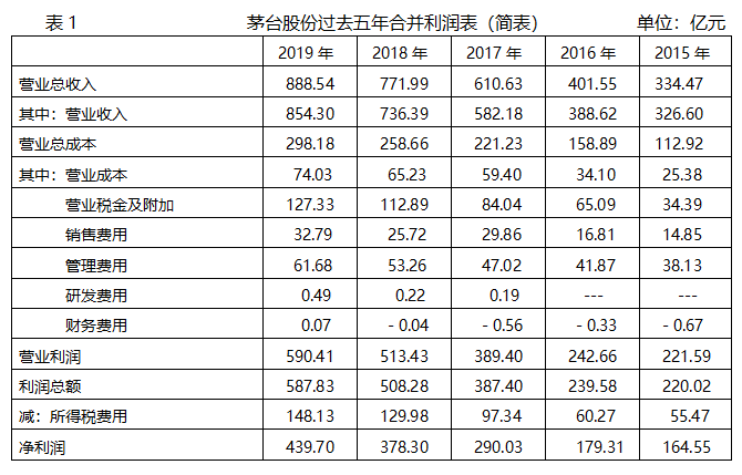 表1列示了茅台股份过去五年的合并利润表,从中可以计算出,茅台过去五年的平均毛利率高达89.6%,平均销售利润率高达50.3 %,平均净资产收益率高达30.2%,盈利能力无以伦比。