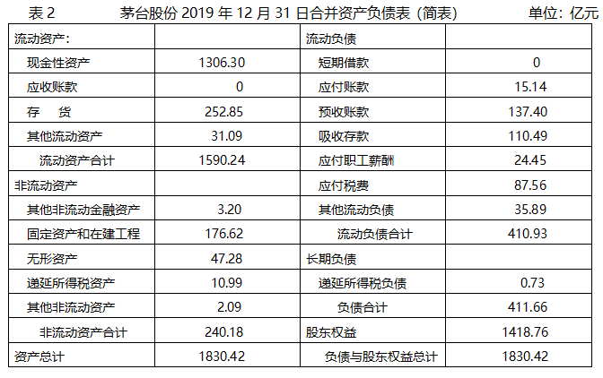 在资产质量方面,茅台可能是世界上最好的上市公司了。从表2可以算出,现金性资产(包括货币资金和高变现力的资金拆借和其他金融资产)是茅台股份最重要的资产,占资产总额的比例高达71.4 %,存货和固定资产仅占资产总额的13.8%和9.6%。