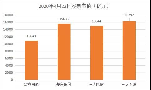 在中国十大市值上市公司中,茅台名列第四,其市值超过三大电信公司之和,与三大石油公司市值之和只差一个涨停板了。更惊艳的是,茅台一家的市值超过了五粮液等17家白酒类上市公司的总和,如图2和图3所示。