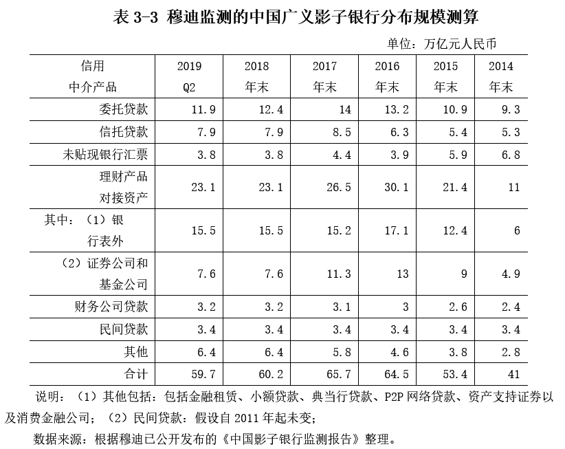 根据穆迪监测,2019年底,中国影子银行的总规模为59万亿元人民币。按照穆迪投资者服务的中国影子银行监测报告,它将中国广义影子银行按照信用中介产品分为委托贷款、信托贷款、未贴现银行汇票、理财产品对接资产、财务公司贷款、民间贷款和其他七大类。从分布规模来看,规模较大的依次是银行表外理财产品对接资产(15.5万亿元)、委托贷款(11.9万亿元)、信托贷款(7.9万亿元)、证券公司和基金公司理财产品对接资产(7.6万亿元)、其他,包括金融租赁、小额贷款、典当行贷款、P2P网络贷款、资产支持证券以及消费金融公司等(6.4万亿元)。