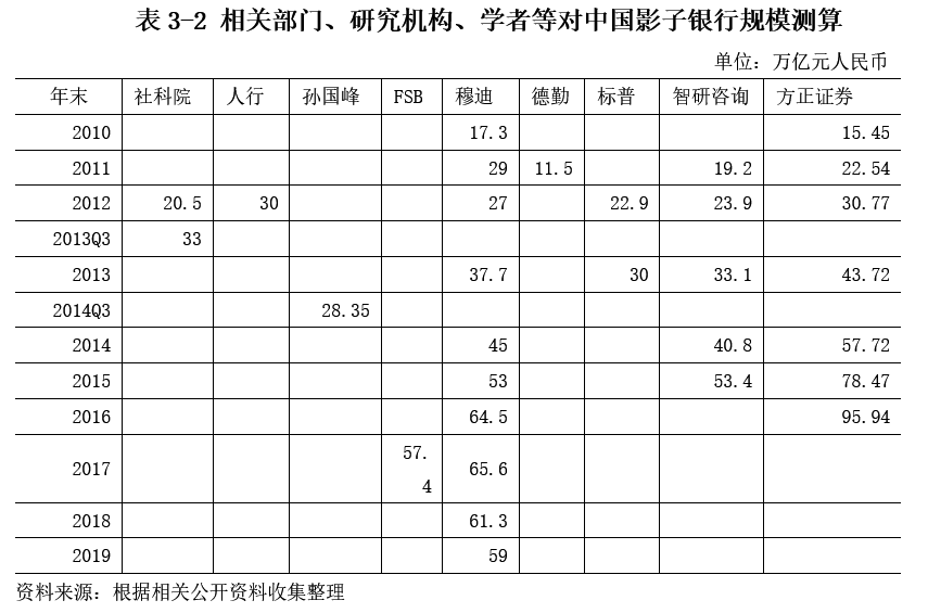 如表3-2显示,长期跟踪测算中国影子银行规模的主要是穆迪投资者投资服务公司。2014年9月22日,穆迪投资者服务公司在香港推出首份中国影子银行季度监测报告,该监测报告利用公开数据对影子银行这一中国金融体系重要组成部分的趋势与发展进行简要分析。此后,穆迪定期发布中国影子银行监测报告。此外,方正证券提供的数据也比较长,但仅来自其2017年《中国影子银行--银行的影子和监管博弈》一份报告中。