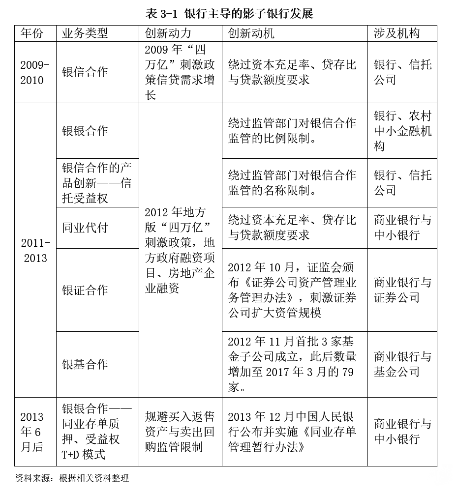 表3-1总结了中国银行主导的影子银行的主要发展阶段与业务模式。其业务模式主要包括三大类,第一类是银信合作,早期信托以银行资金持有银行资产,名义上帮助银行将其表内资产转出资产负债表,进而降低银行信贷占用额度,最初以贴现票据为主;由于监管部门严禁未有实质风险交易的通道业务,此后该类业务由信托与银行合作的理财产品资金支持,转为信托受益权业务;第二类是银银合作产品,即大中型银行与小型城商行、农信社等之间的同业代付业务与银银合作产品,该类业务的特点是本质上为企业提供了贷款资金,而在会计处理上,被记着了同业代付(往来),进而绕过了信贷额度、存贷比与资本充足率三项监管要求;第三类非银行金融机构,包括信托、证券、基金、保险等以自有资金支持银行资产出表,但该类业务风险并未完全实质转移,往往通过买入返售等形式,将风险保留在银行,非银行金融机构只是提供批发资金将银行资产移至表外。