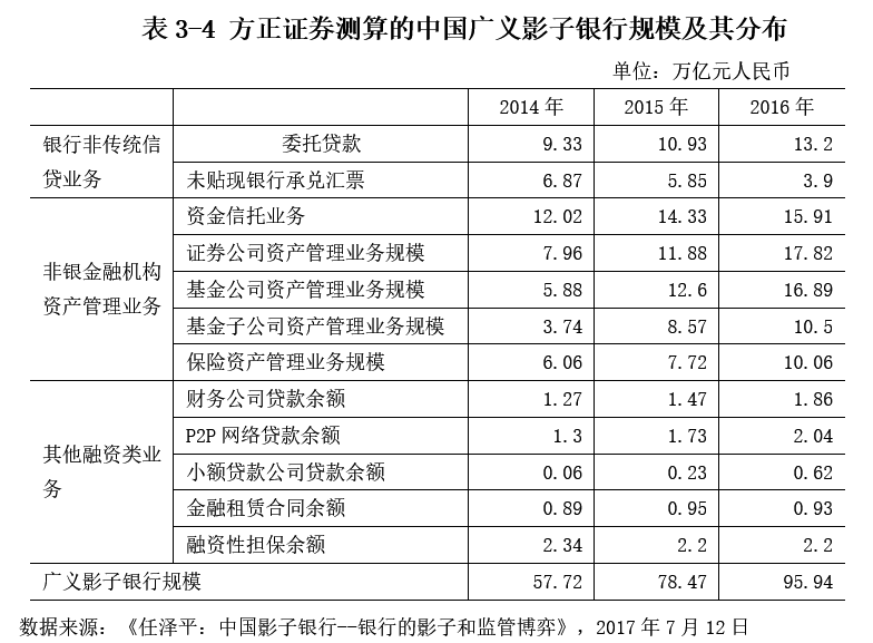 表3-4为方正证券测算的中国广义影子银行规模及其分布概况,在总规模上,方正证券为接近96万亿元,穆迪同期为64.5万亿。《任泽平:中国影子银行--银行的影子和监管博弈》文中特别说明:“中国影子银行的规模有多大:我们采用广义口径测算, 2010年以前,中国影子银行规模在8万亿以下,此后飙涨,截至2016年底广义影子银行规模将近96万亿(剔除重复计算64.5万亿)”,表明其和穆迪测算规模的趋同性。从分布来看,能够明确的具体项目如委托贷款、未贴现银行承兑汇票等金额是相同的,差异部分主要是非银金融机构资产管理业务,剔除信托外,穆迪该项目为30万亿元,而方正证券为55.81万亿元,两者相差26万亿元,资金信托业务与穆迪公司的信托贷款相差9.61万亿元,两者合计相差超过30万亿元人民币规模。从差异的实质来看,本质上属于非银金融机构资产管理业务是否属于影子银行范畴之争,正如前文对影子银行与资产管理业务的概念界定,影子银行本质上属于“非银行信贷中介活动”,资产管理业务资金来源不仅包括债务筹资,更应该包括权益筹资,因此,从这个意义上说,穆迪的测算规模更符合影子银行的本质,这也是方正证券声明“剔除重复计算64.5万亿”的原因所在。