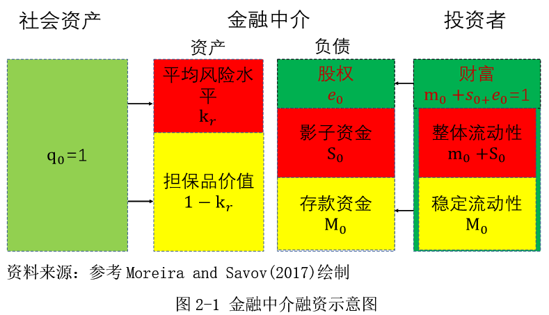关于影子银行的作用及其风险演变机制,Moreira and Savov(2017)构建了一个精巧的影子银行发展宏观经济学模型。其核心思想如下图2-1所示,金融中介以存量资产为担保,向投资者发行差异化的融资工具——分别为低收益低风险的债权融资工具——存款资金(money),影子银行的债权工具——影子资金(shadow money)以及权益工具——股权(equity),为资产持有者进行融资。模型的精妙之处在于融资约束条件的理解与设定,根据一般金融理论——风险与收益相匹配的理论,高风险资产(即遭遇暴跌概率很高的资产)需要通过股权融资来匹配,风险较高的资产通过影子银行融资来实现,风险较低的资产则通过低收益的存款资金来匹配融资。由于经济中广泛存在信息不对称,社会资产平均风险水平(平均下跌概率)为