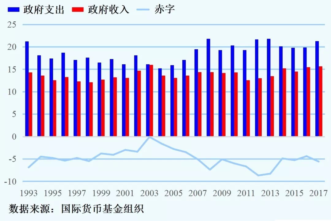 图 10. 1993-2017年巴基斯坦政府赤字(%)