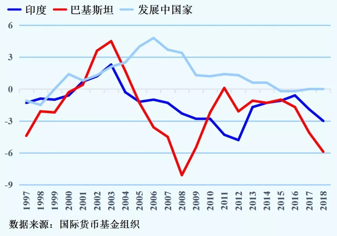 图 9. 1997-2018年巴基斯坦、印度和发展中国家的经常账户平衡(%)