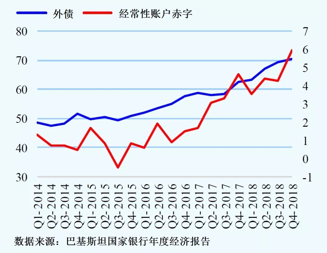图 8. 2014年第一季度-2018年第四季度巴基斯坦外债存量与经常账户赤字(单位:十亿美元)