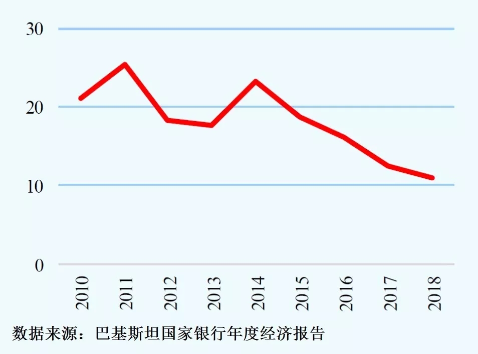 财政赤字水平较高。根据国际货币基金组织的数据显示,巴基斯坦财政长期处于入不敷出的状态,因此需要靠借债来填补赤字,从而造成政府债务水平居高不下(图10)。目前,巴基斯坦政府已在2017至2018财政年度对财政赤字进行控制,预计巴基斯坦2018财年财政赤字占GDP比重将下降到4.1%。尽管如此,巴基斯坦财政目前仍然处于支出大于收入的赤字状态,使得巴基斯坦的偿债压力剧增。