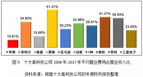 从产品获利能力来看。2008年至2017年,苹果公司的平均销售毛利率为39.30%,略高于三星电子的36.10%,在十大高科技公司中排名倒数第四(如图3所示)。同期,思科、英特尔、谷歌、微软的平均销售毛利率均在60%以上。