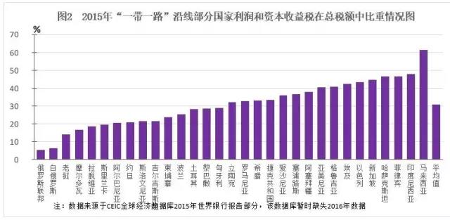 在税种征收比重上,比如利润和资本收益税,如图2所示,尽管“一带一路”沿线国家基本都开征了公司税和资本利得税并作为主要征收税种,但是,其在征税总额中所占比重并不高,平均值仅为30%。其中,独联体国家中的俄罗斯联邦和白俄罗斯征收的利润和资本收益税占总税额的比重仅有5%,远远低于所列举国家的均值水平,而亚美尼亚、格鲁吉亚、埃及、以色列、新加坡哈萨克斯坦、菲律宾、印度尼西亚以及马来西亚等8个国家的利润和资本利得税的纳税比重超过了企业纳税总额的40%(高于总体均值10个百分点之多),尤其是马来西亚达到60%之上。