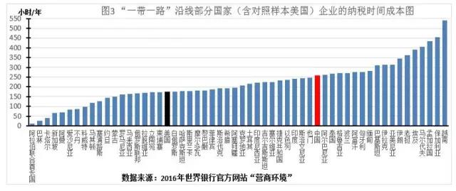 从图3中可知,沿线国家企业围绕纳税事项花费的时间成本,阿拉伯联合酋长国、巴林和卡塔尔最少,每年分别是12小时、27小时和41小时,其原因可能是与这些国家的税制结构简单、办税程序不复杂有关。与其形成鲜明对比的是伊朗、老挝、埃及、马尔代夫、孟加拉国、保加利亚和越南等国家,这些国家的企业围绕纳税事项所花费的时间成本最高,每年超过350小时,尤其是越南接近550小时。这些国家在税收制度上的共同特点是税制设计复杂、纳税资料繁杂以及报税程序繁多,还有一个特点就是税务系统行政效率低下(刘荣等,2017)。