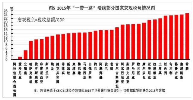 从下图5“一带一路”沿线国家的宏观税负样本中,我们可以发现,宏观税负水平最低的国家是阿拉伯联合酋长国、爱沙尼亚、立陶宛和哈塞克斯坦,不及10%。这几个国家的宏观税负之所以低的一个重要原因是,经济发展水平高这、税制结构简单、征税种类少以及税率设置相对不高。与其相反,土耳其、以色列、匈牙利、格鲁吉亚、塞浦路斯和希腊等国家的宏观税收负高达20%以上,成为税收负担最重的国家。
