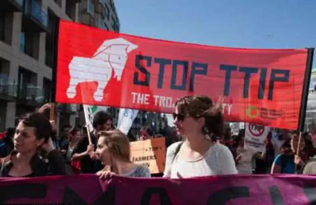 图3 2015年4月18日,比利时布鲁塞尔民众举行集会游行活动,抗议跨大西洋贸易与投资伙伴协议(TTIP)。