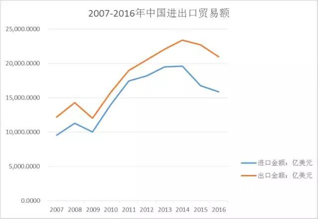 2008年以来,中国外贸进出口增速回落,尤其是自2011年以后,中国的进出口贸易额增长趋势明显放缓,于2014年掉头向下,如图2所示。