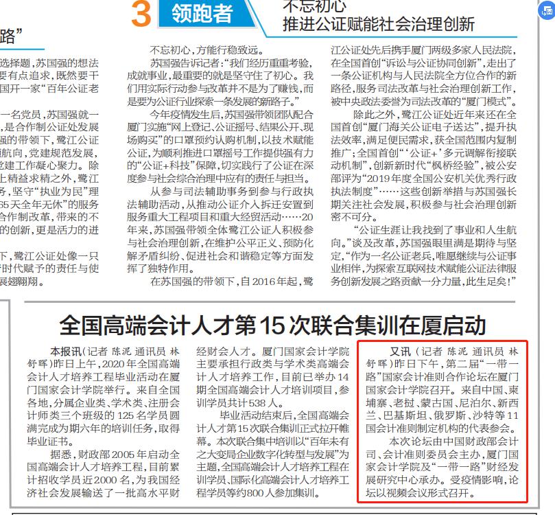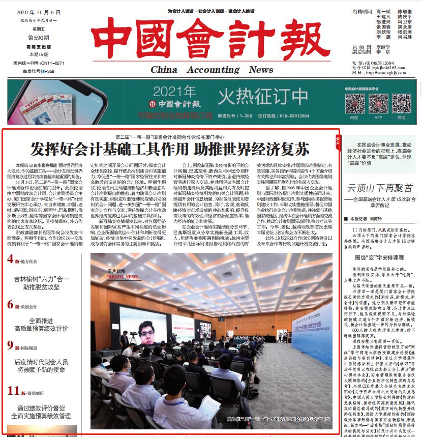 2020年11月3日,第二届“一带一路”国家会计准则合作论坛在学院成功举办,本次论坛由中国财政部会计司、会计准则委员会主办,厦门国家会计学院及“一带一路”财经发展研究中心承办。论坛有关工作取得了“一带一路”国家会计准则制定机构的支持和积极反馈,并引发媒体的广泛关注。
