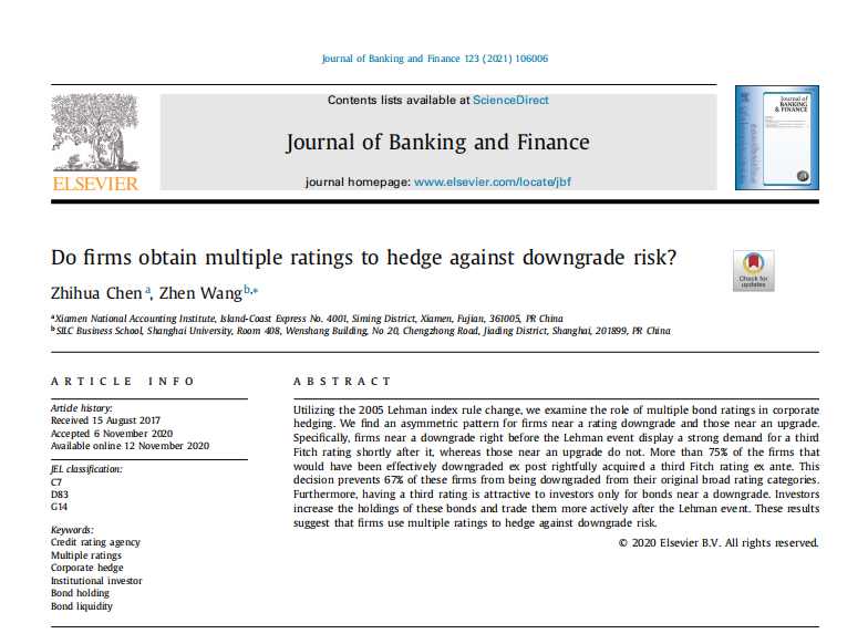 我院“一带一路”财经发展研究中心陈智华副教授与上海大学王甄副教授合作撰写的论文“Do firms obtain multiple ratings to hedge against downgrade risk?”在Journal of Banking and Finance 2021年第2期正式发表。该期刊为国际学术界公认的金融领域高质量期刊,也是清华大学、中国人民大学、厦门大学等高校规定的金融学国际A-类期刊,其最新公布的五年影响因子为3.377。
